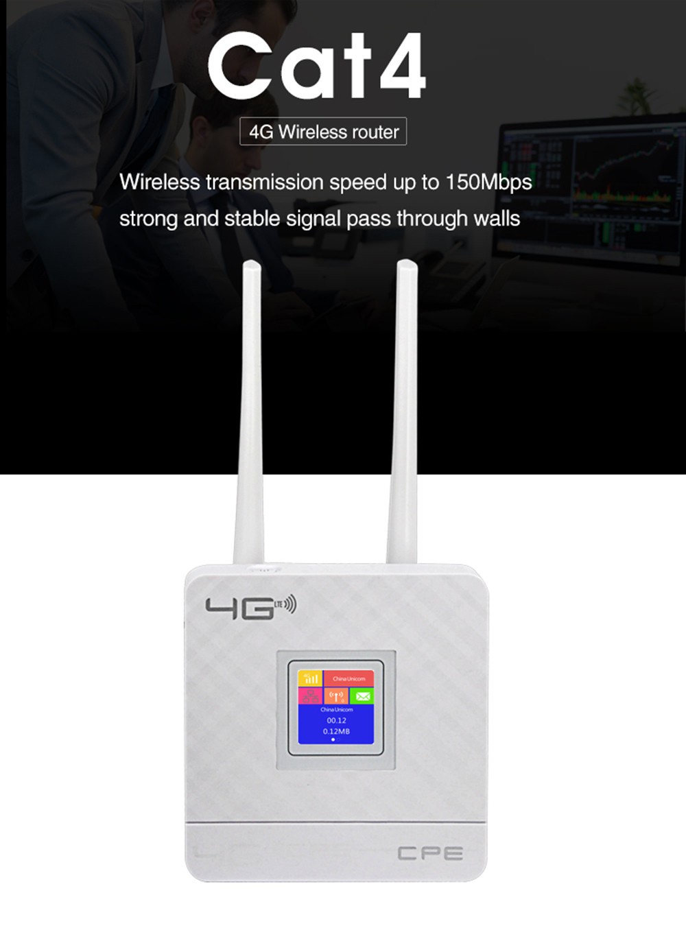 CPE903 är en hög effekt 4G trådlös router med 4G sim kort kort kortplats och MIPS-nätverksprocessor, det är en lösning för företag, hem, företag, kontorets Wi-Fi-nätverk. Den är kompatibel med IEEE 802.11b/g/n-standard, datahastigheten når upp till 300 Mbps. Med dubbla externa antenner är Wi-Fi-signalen stabilare och längre räckvidd. Det stöder 10 Wi-Fi-användare samtidigt.