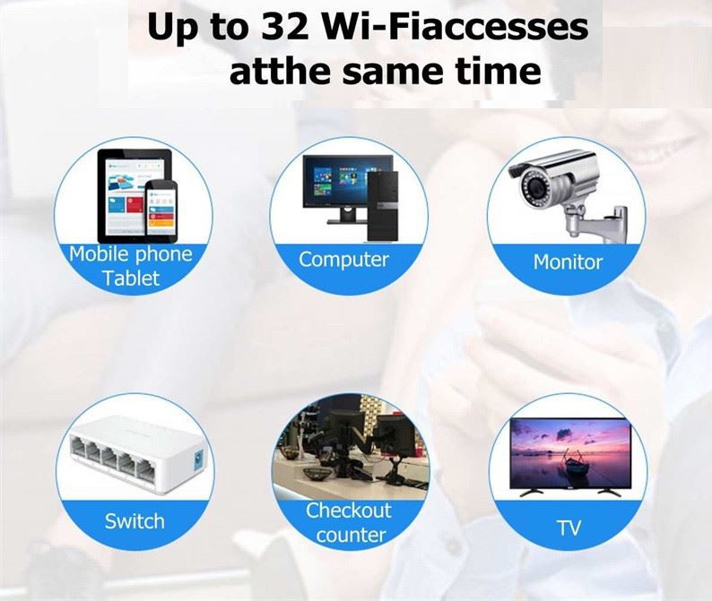 Upp till 32 WiFi kommer åt samtidigt. Medan 4G-routern överför WiFi kan den också ansluta datorer, bildskärmar, switchar, kassaapparater, TV-apparater och annan utrustning med nätverkskablar samtidigt.